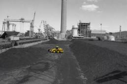 Dopo l’approdo delle navi portarinfuse, il carbone entra dunque in una fase cruciale del processo industriale che dopo lo sbarco, prevede la movimentazione meccanizzata e il deposito controllato del combustibile. In questa sequenza operativa, gli scaricatori portuali, normalmente equipaggiati con benne mordenti, prelevano il materiale direttamente dalle stive e lo riversano entro tramogge di raccolta collocate in banchina, dalle quali viene poi trasferito ai sistemi interni di convogliamento. A partire da qui, una rete di nastri trasportatori, opportunamente raccordata con torri di rinvio e organi di regolazione del flusso, provvede all’inoltro continuo del carbone verso le aree di accumulo (parco carbone) dove il combustibile viene scaricato e distribuito in cumuli.