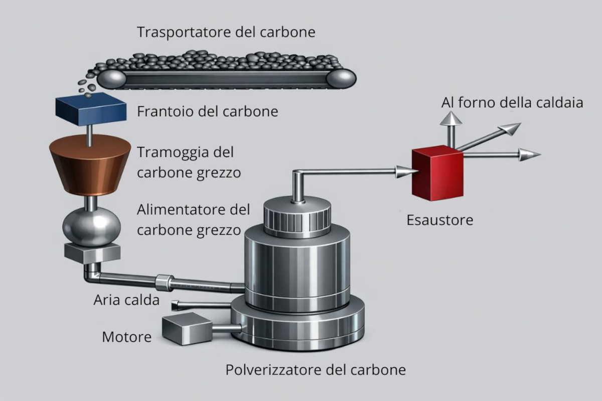 Dai bunker il carbone viene dosato e fatto scendere ai mulini, che hanno il compito di ridurlo in una polvere finissima, il cosiddetto polverino di carbone. Questa trasformazione è essenziale, perché il carbone in polvere brucia molto più rapidamente e in modo più regolare rispetto al carbone in pezzatura, rendendo possibile una combustione continua ed efficiente nel focolare della caldaia. All’interno dei mulini, inoltre, avviene spesso anche una fase di essiccamento: il carbone grezzo, infatti, può contenere una certa quantità di umidità che, se non rimossa, peggiora la combustione e riduce il rendimento del processo. Per questo viene immessa aria primaria calda, cioè il flusso d’aria destinato sia ad asciugare il carbone sia a trascinare il polverino prodotto.