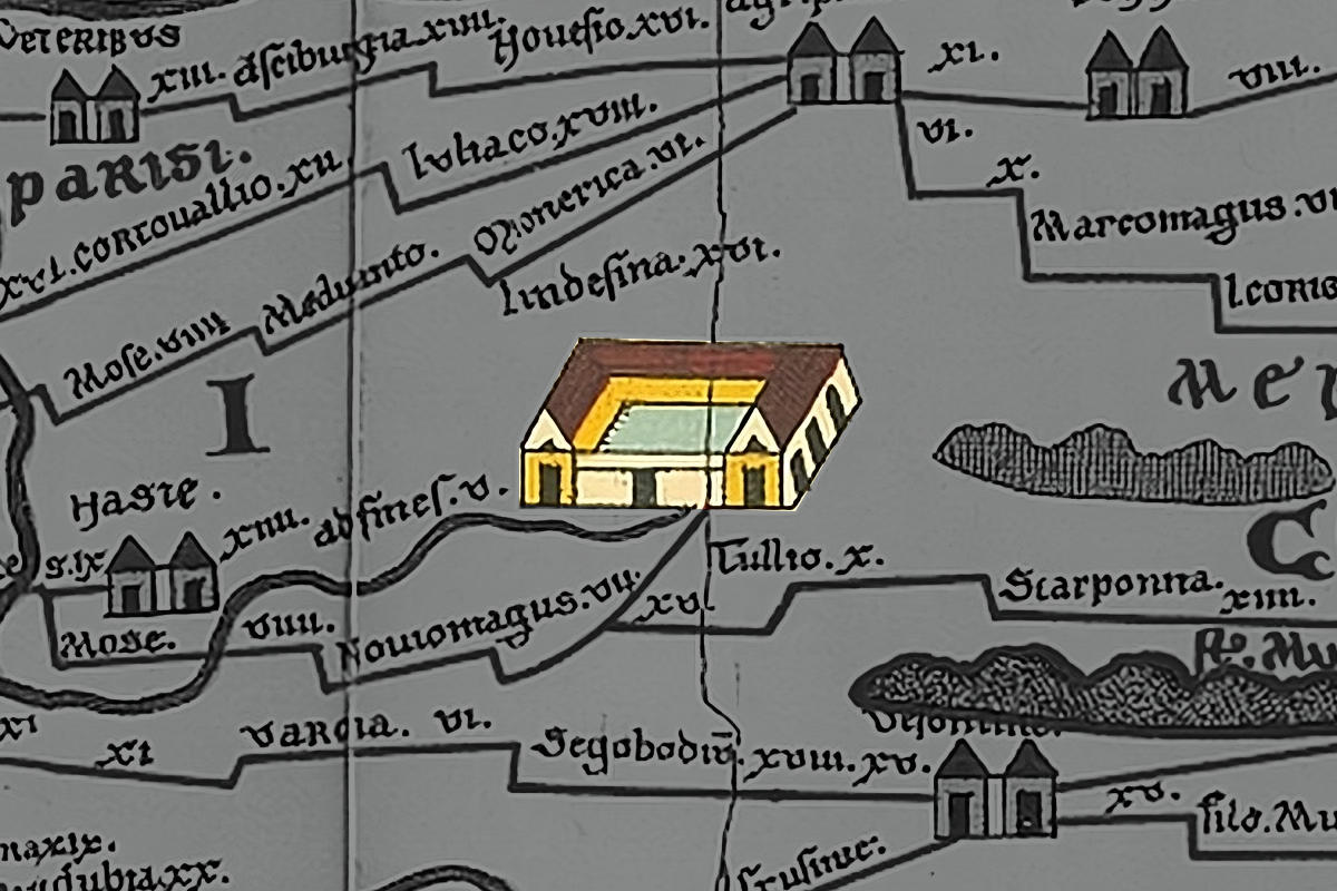 Particolarmente rilevante è la cosiddetta “vignetta delle aquae”, attestata anche in corrispondenza del contemporaneo areale di Monfalcone. L’icona rappresenta un edificio a corte centrale in pseudo-assonometria, con il perimetro interno reso cromaticamente in azzurro nella maggioranza delle occorrenze. In ventotto casi è accompagnata dall’iscrizione aqua o aquae, con evidente riferimento a sorgenti minerali o impianti balneari; in altri quattordici esempi, invece, la raffigurazione appare priva di glosse, ma talora affiancata da etichette quali praetoria, identificabili con sedi di controllo amministrativo o doganale, oppure tabernae. Rimangono infine dieci attestazioni di edifici analoghi, a pianta quadrangolare, con coperture e particolari variabili che ne complicano l’assimilazione diretta alle forme dotate di titolatura.